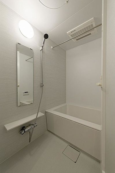 浴室乾燥機つきのシンプルですっきりとしたバスルーム