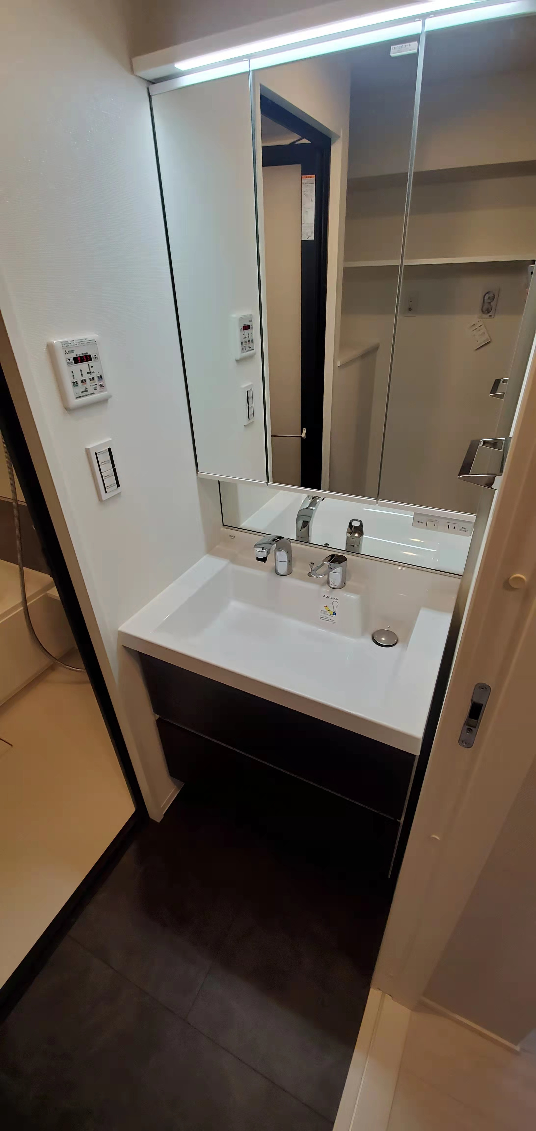 独立洗面台は三面鏡になっているので